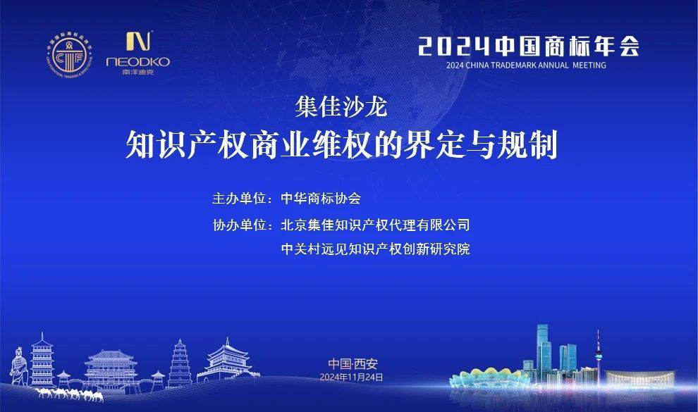 由中華商標(biāo)協(xié)會(huì)主辦,陜西省品牌建設(shè)促進(jìn)中心、中企商標(biāo)發(fā)展中心承辦,陜西南洋迪克家具制造有限公司總協(xié)辦的第十四屆中國(guó)國(guó)際商標(biāo)品牌節(jié)于2024年11月22日至25日在陜西省西安市盛大舉行。11月24日,由中華商標(biāo)協(xié)會(huì)主辦、北京集佳知識(shí)產(chǎn)權(quán)代理有限公司與中關(guān)村遠(yuǎn)見(jiàn)知識(shí)產(chǎn)權(quán)創(chuàng)新研究院協(xié)辦的“集佳沙龍——知識(shí)產(chǎn)權(quán)商業(yè)維權(quán)的界定與規(guī)制”主題活動(dòng)在西安國(guó)際會(huì)展中心成功舉辦。本屆沙龍力邀多位資深專(zhuān)家,圍繞知識(shí)產(chǎn)權(quán)商業(yè)維權(quán)的難點(diǎn)和熱點(diǎn)問(wèn)題,進(jìn)行了充分的探討和交流,吸引了來(lái)自國(guó)內(nèi)外企業(yè)、知識(shí)產(chǎn)權(quán)服務(wù)機(jī)構(gòu)以及相關(guān)協(xié)會(huì)組織的200余位代表前來(lái)參與。