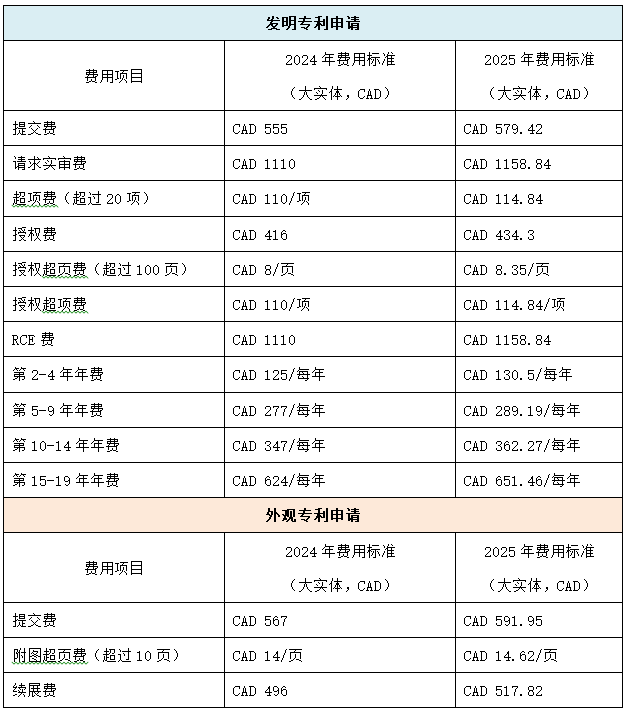 根據(jù)加拿大《服務(wù)費(fèi)法案》的規(guī)定,加拿大專利申請中大多數(shù)費(fèi)用將根據(jù)消費(fèi)者價(jià)格指數(shù)(CPI)每年進(jìn)行調(diào)整。目前在加拿大知識產(chǎn)權(quán)局官網(wǎng)公布的2025年預(yù)計(jì)調(diào)整的費(fèi)用如下,按照以往慣例,每年最終調(diào)整的費(fèi)用將按照四舍五入的原則取整數(shù),因此,最終調(diào)整后的費(fèi)用可能與下方所列費(fèi)用有出入。