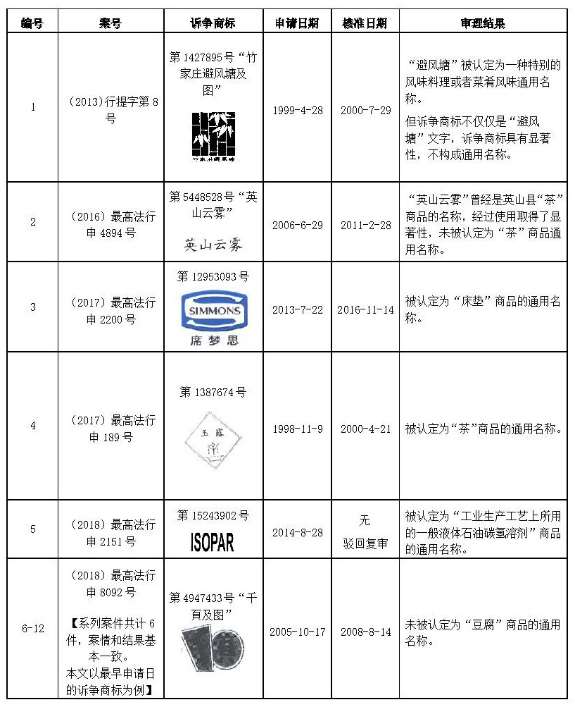 經(jīng)查閱從2015年至今,中國裁判文書網(wǎng)收錄最高人民法院涉及“通用名稱”商標確權案件的行政裁判文書共計12份,包括11份行政裁定書和1份行政判決書,裁判作出的時間是2015年至2019年。筆者以這些文書為研究樣本,分析商標確權中法院認定通用名稱的考量因素和裁判標準。