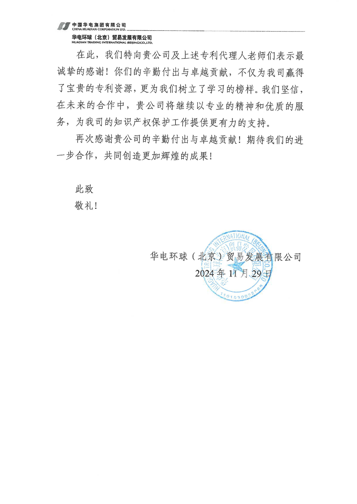 近日,集佳收到客戶華電環(huán)球(北京)貿易發(fā)展有限公司的感謝信,對集佳在知識產權申報與保護工作中給予的專業(yè)指導與大力支持表示由衷感謝,同時對集佳孫越、馬小青、王偉力、李上、王榮鑫等專業(yè)人員在專利代理工作中所展現出的專業(yè)精神與卓越成就表示高度贊揚!