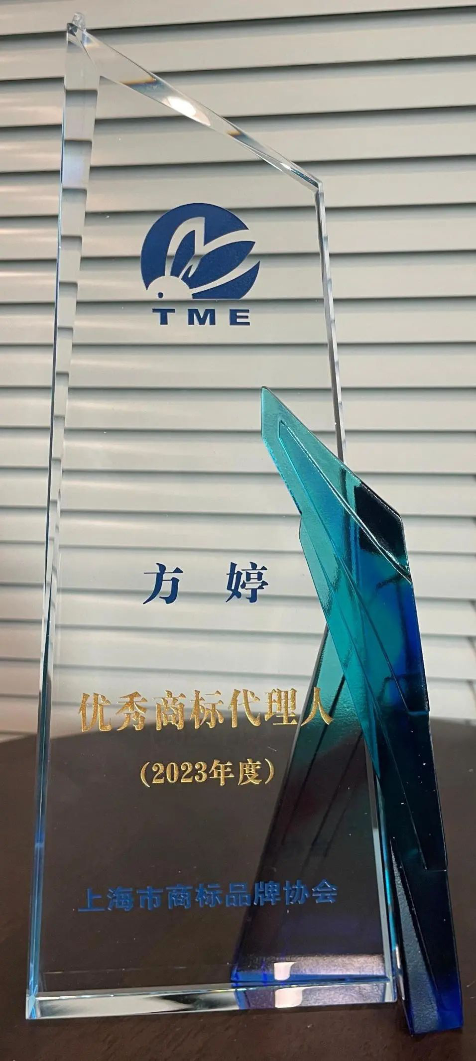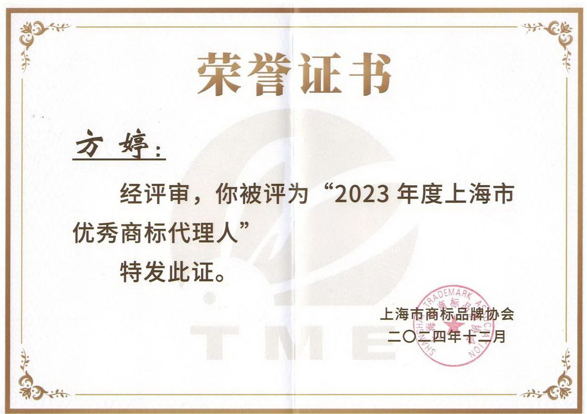 集佳上海分所方婷律師被評為2023年度“上海市優(yōu)秀商標代理人”。