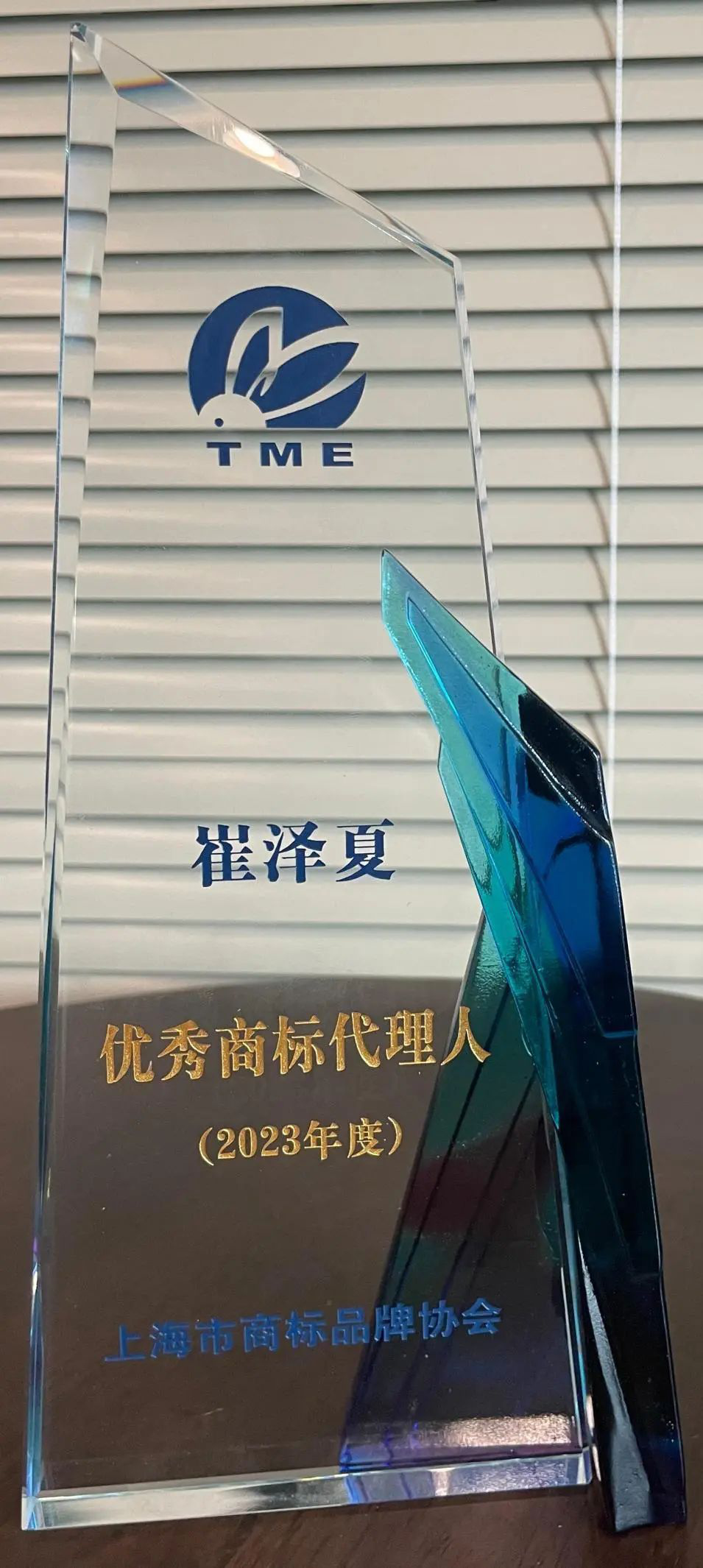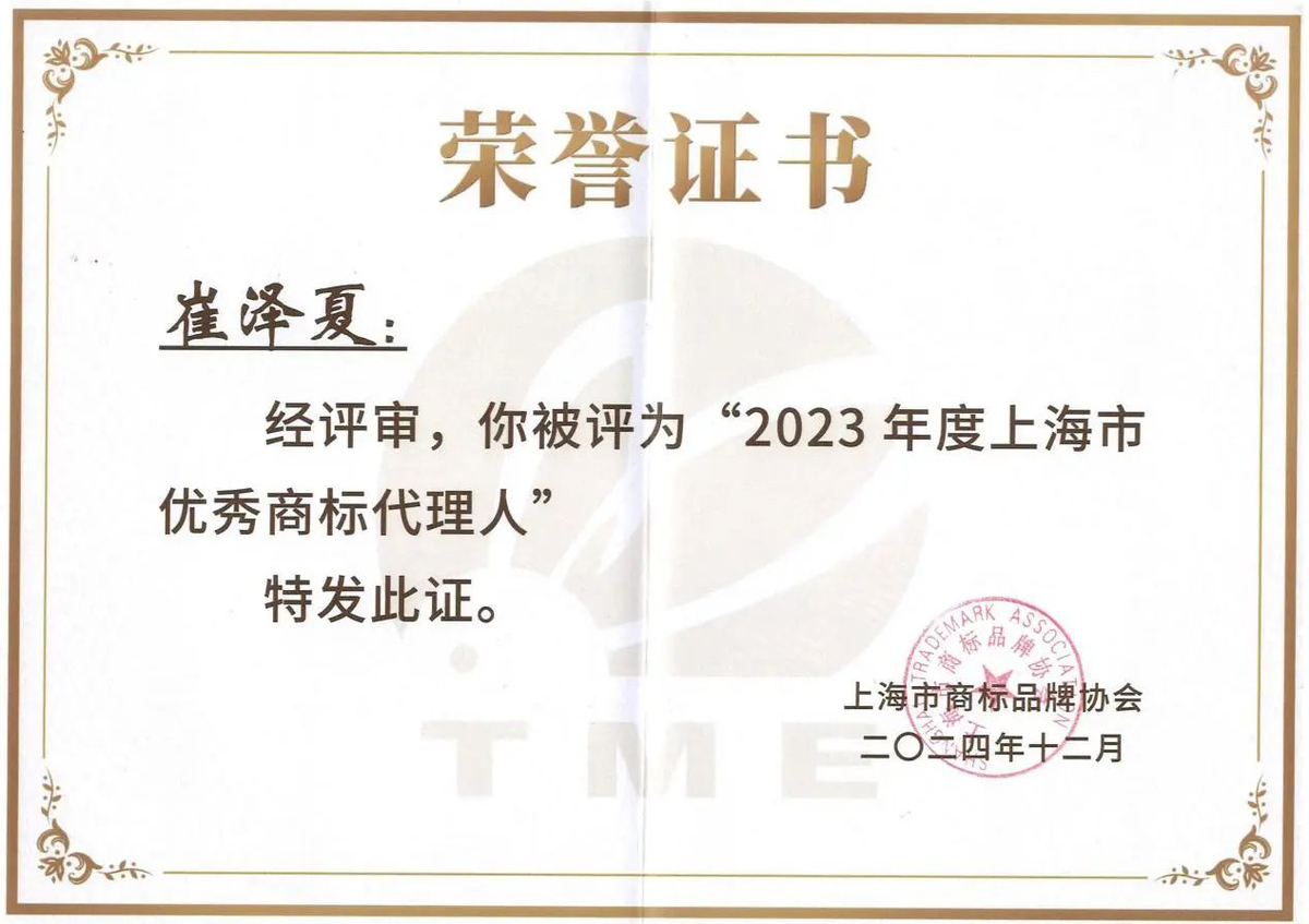 集佳上海分所崔澤夏律師被評為2023年度“上海市優(yōu)秀商標代理人”。