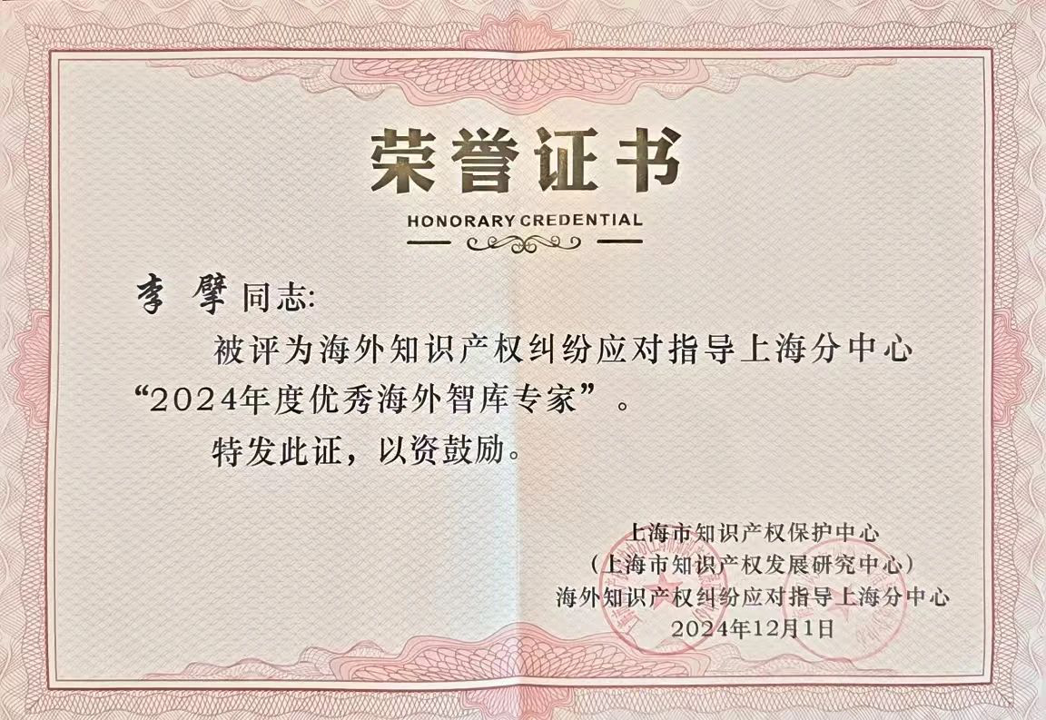 集佳上海分所合伙人李擘律師憑借在海外知識(shí)產(chǎn)權(quán)爭(zhēng)議糾紛解決領(lǐng)域的卓越能力及客戶的認(rèn)可,被評(píng)為海外知識(shí)產(chǎn)權(quán)糾紛應(yīng)對(duì)指導(dǎo)上海分中心“2024年度優(yōu)秀海外智庫(kù)專家”。