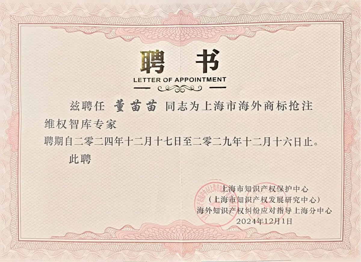 董苗苗律師從眾多候選人中脫穎而出,被聘任為上海市海外商標(biāo)搶注維權(quán)智庫(kù)專家。