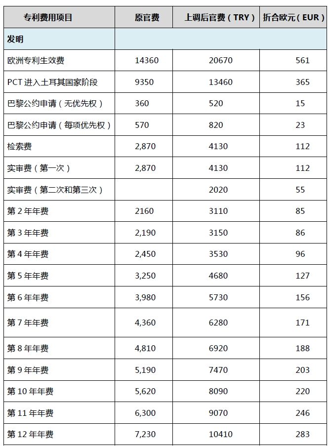 自2025年1月1日起,土耳其專利局適用新的官費(fèi)標(biāo)準(zhǔn)。