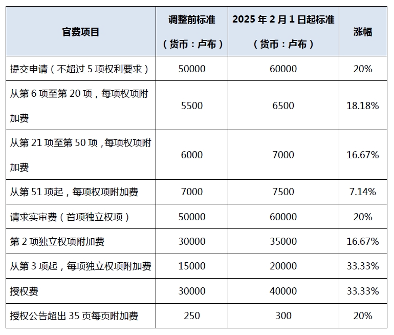 歐亞專利局于2025年1月14日公布通知,稱由于通貨膨脹與匯率波動(dòng),歐亞專利申請(qǐng)的部分費(fèi)用將需要調(diào)整。目前調(diào)整后的費(fèi)用已于2025年2月1日生效。