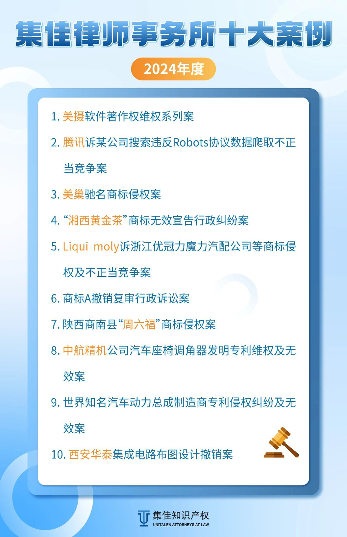 在世界知識(shí)產(chǎn)權(quán)日來(lái)臨之際,集佳律所從代理的眾多知識(shí)產(chǎn)權(quán)案件中篩選出2024年度具有代表性的十大案例,與各界同仁分享。這些案例具有較強(qiáng)的法律適用的典型意義和較大的社會(huì)影響,充分體現(xiàn)了國(guó)家知識(shí)產(chǎn)權(quán)保護(hù)的良好水平,體現(xiàn)了訴訟代理團(tuán)隊(duì)的專業(yè)水準(zhǔn),同時(shí)也為與之類似案件提供了可資借鑒的維權(quán)范本。以下為2024年度北京市集佳律師事務(wù)所十大案例名錄: