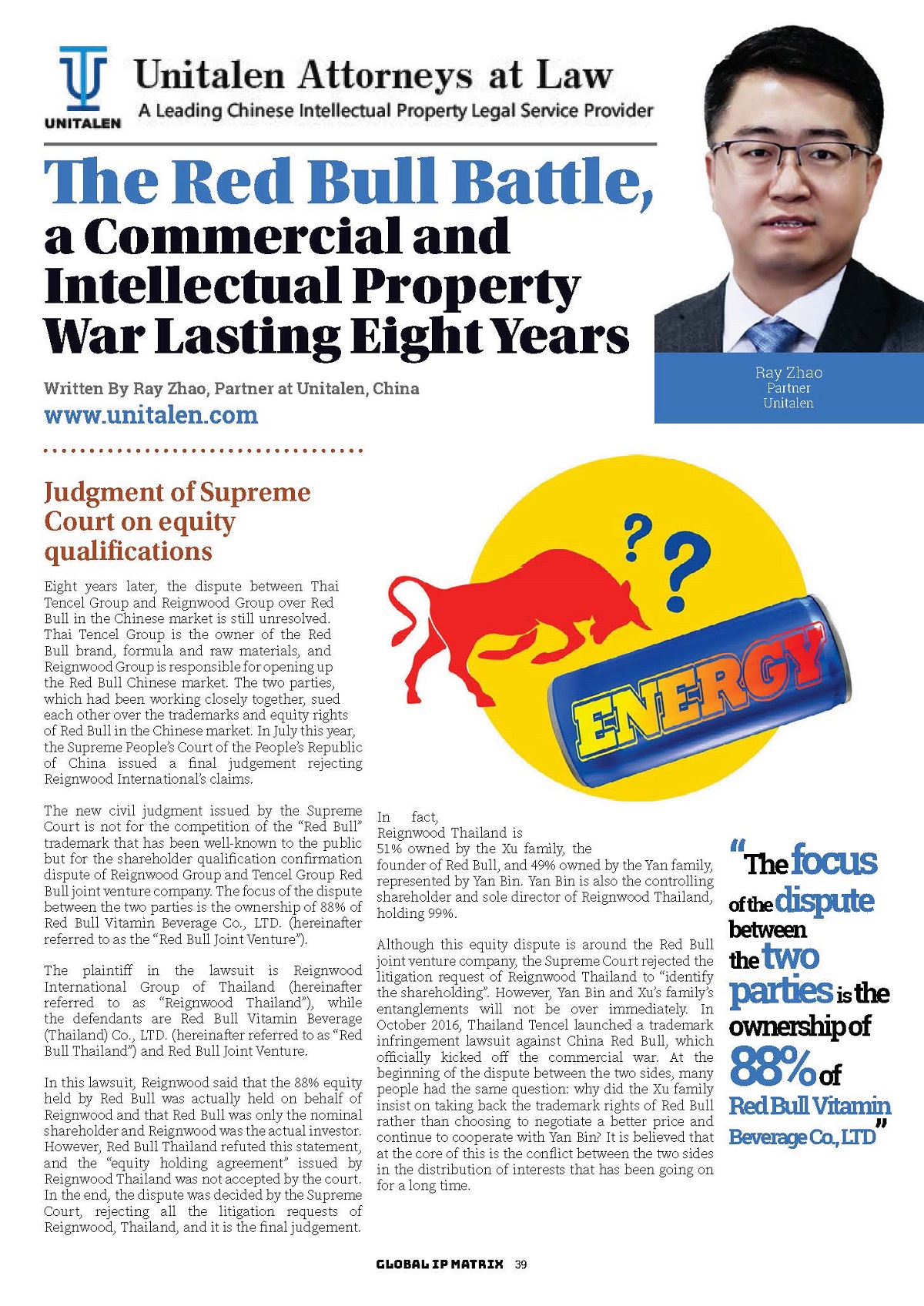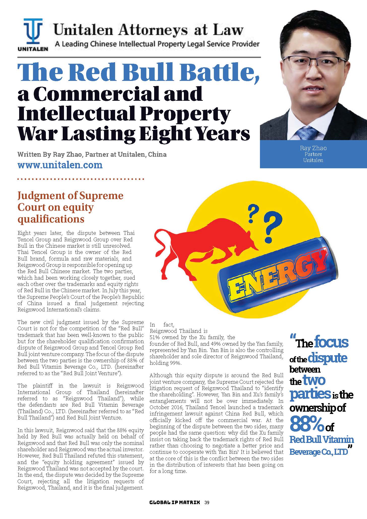 集佳文章《The Red Bull Battle, a Commercial and Intellectual Property War Lasting Eight Years》在《Global IP Matrix》上發(fā)表