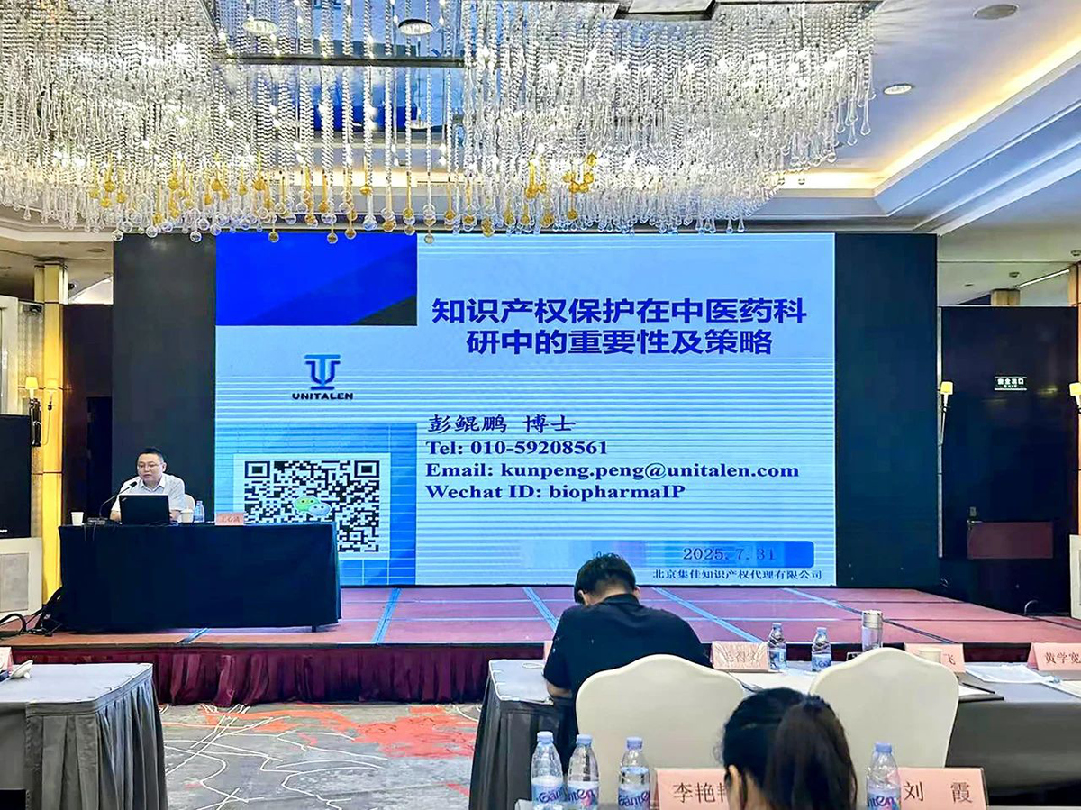 2025年7月31日,重慶市衛(wèi)生健康委員會(huì)主辦的 “2025年全市中醫(yī)藥科技創(chuàng)新能力提升培訓(xùn)班” 在重慶歐瑞大酒店舉行。集佳合伙人彭鯤鵬博士受邀主講 “知識(shí)產(chǎn)權(quán)保護(hù)在中醫(yī)藥科研中的重要性及策略”,為全市二級(jí)以上公立中醫(yī)醫(yī)療機(jī)構(gòu)分管領(lǐng)導(dǎo)、科研負(fù)責(zé)人及巴渝岐黃學(xué)者等帶來專業(yè)解讀,助力中醫(yī)藥科研成果轉(zhuǎn)化與權(quán)益保護(hù)。