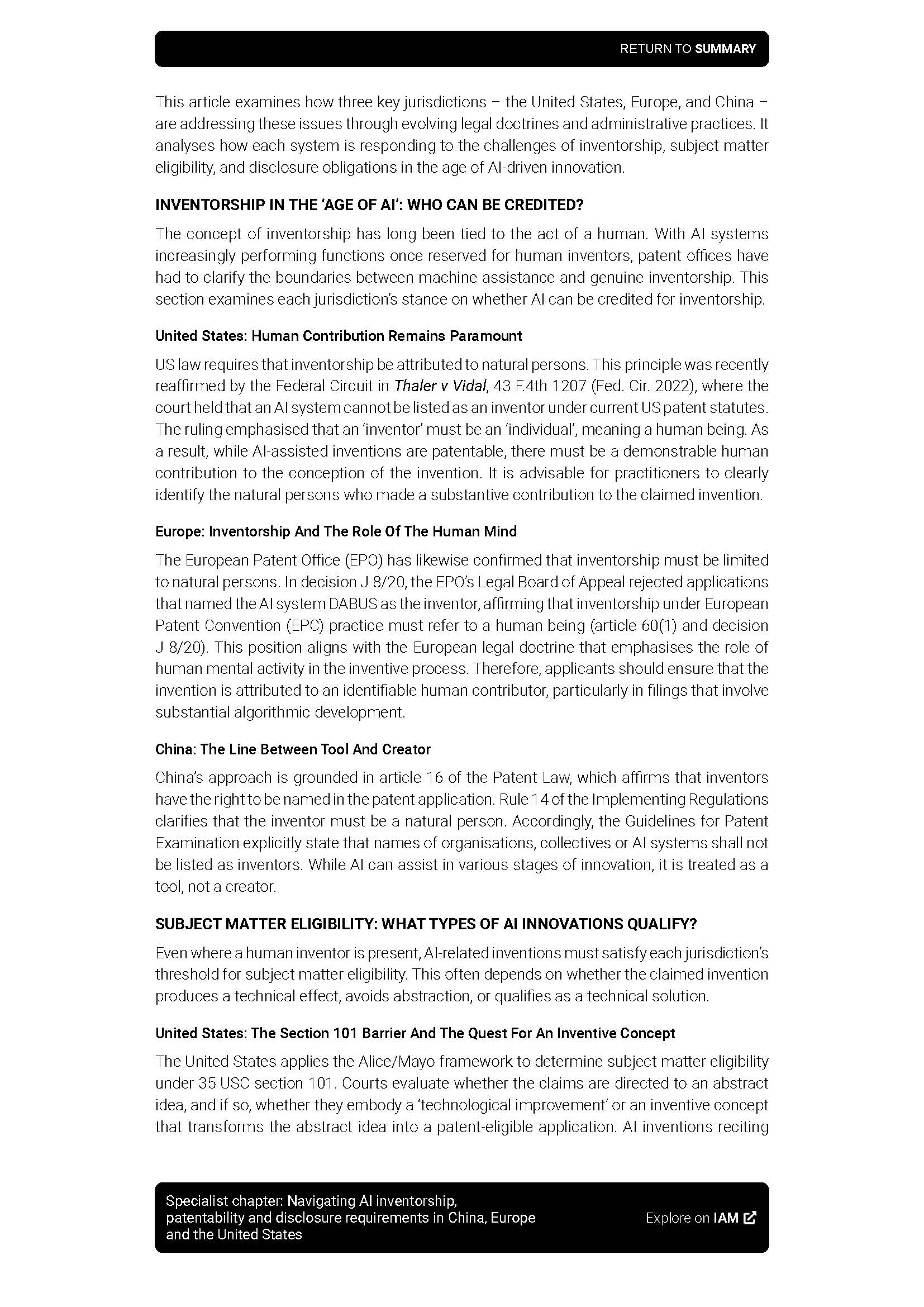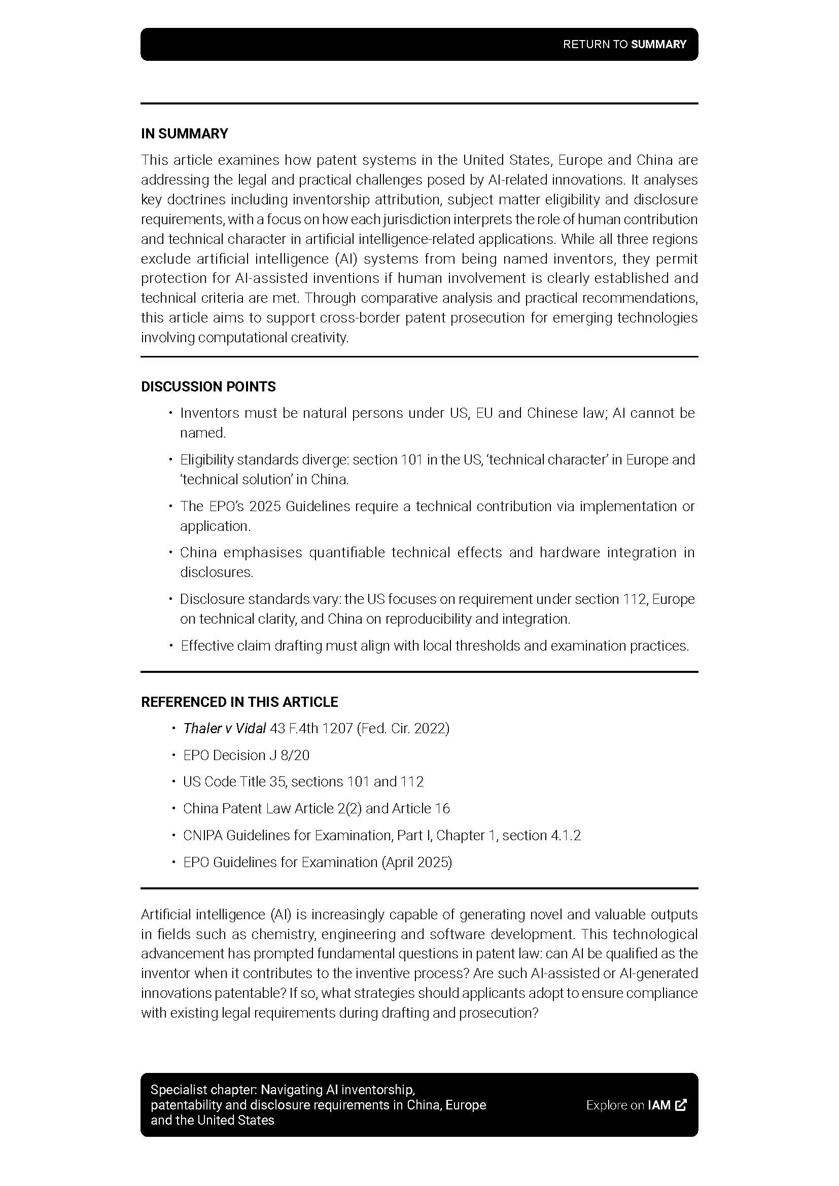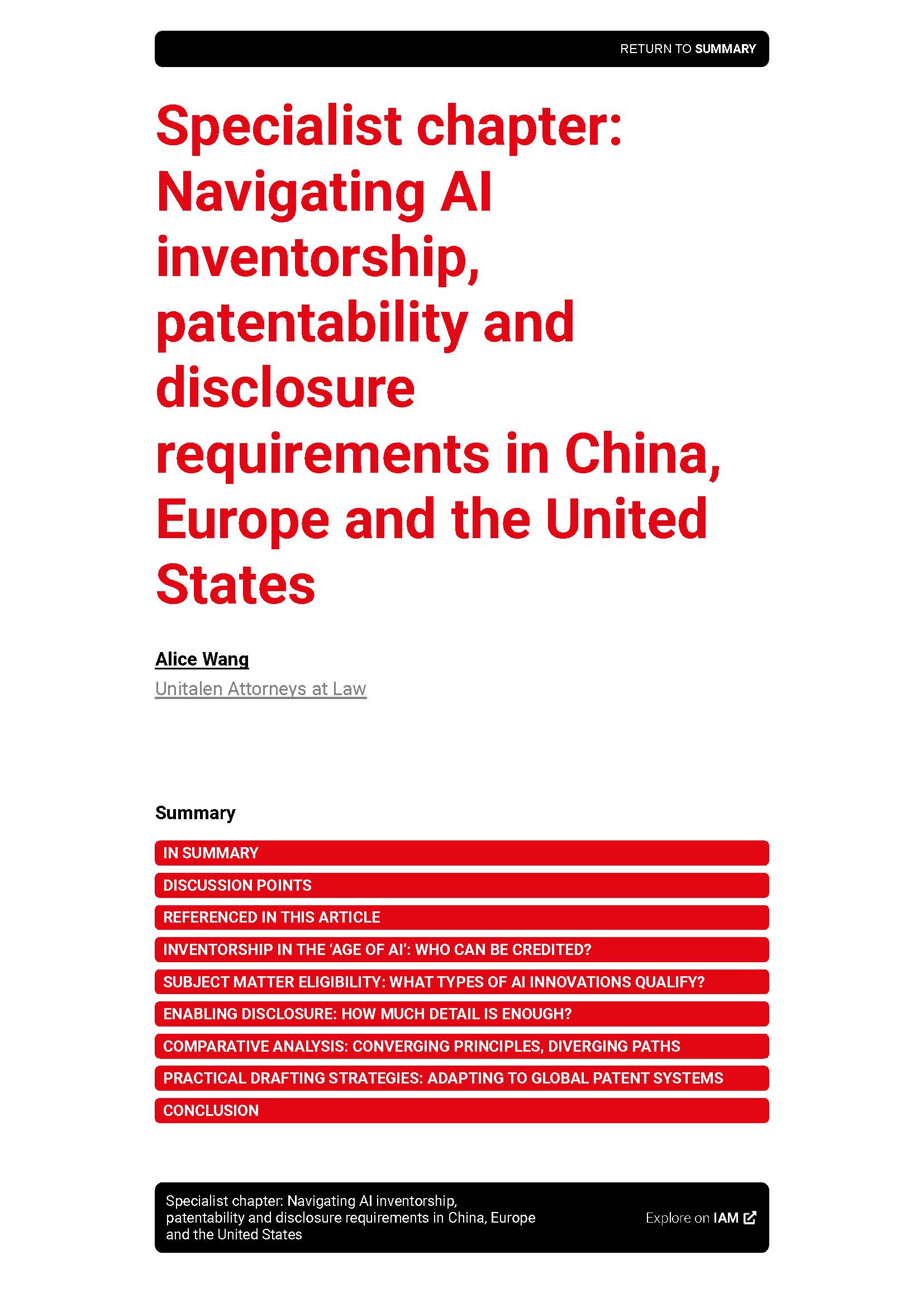 集佳文章《Specialist chapter:Navigating AI inventorship, patentability and disclosure requirements in China, Europe and the United States》在《IAM》發(fā)表